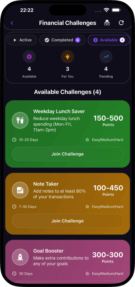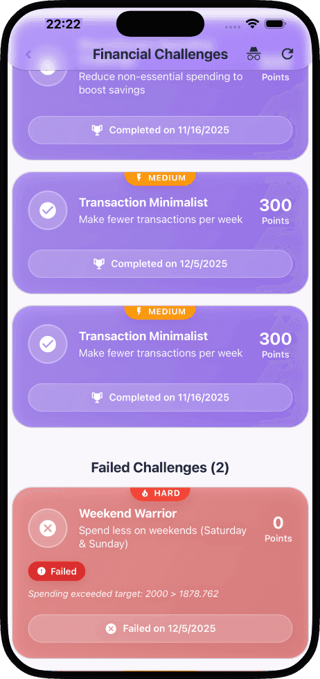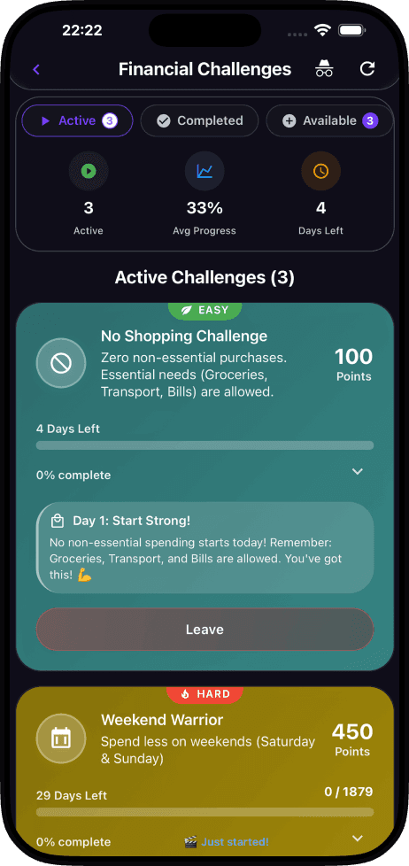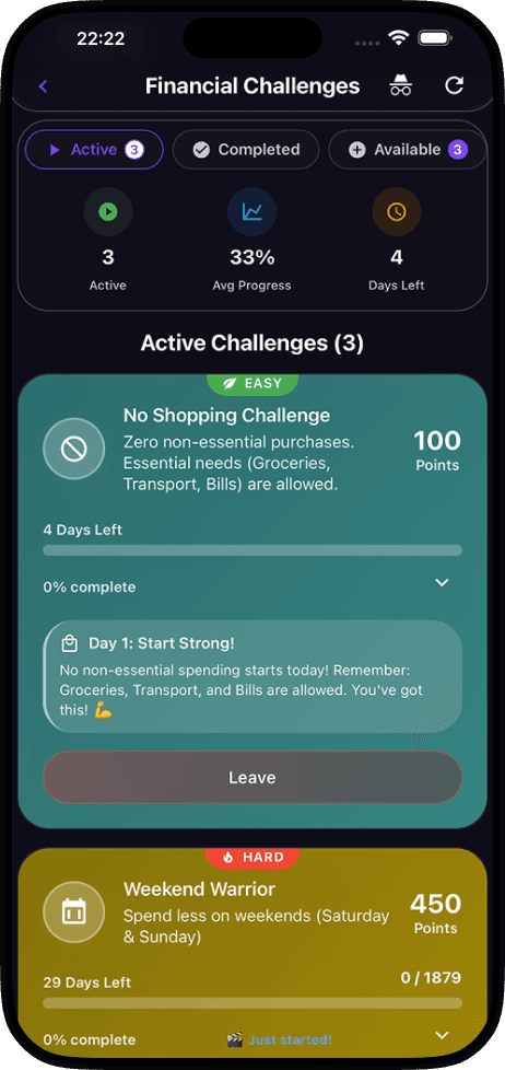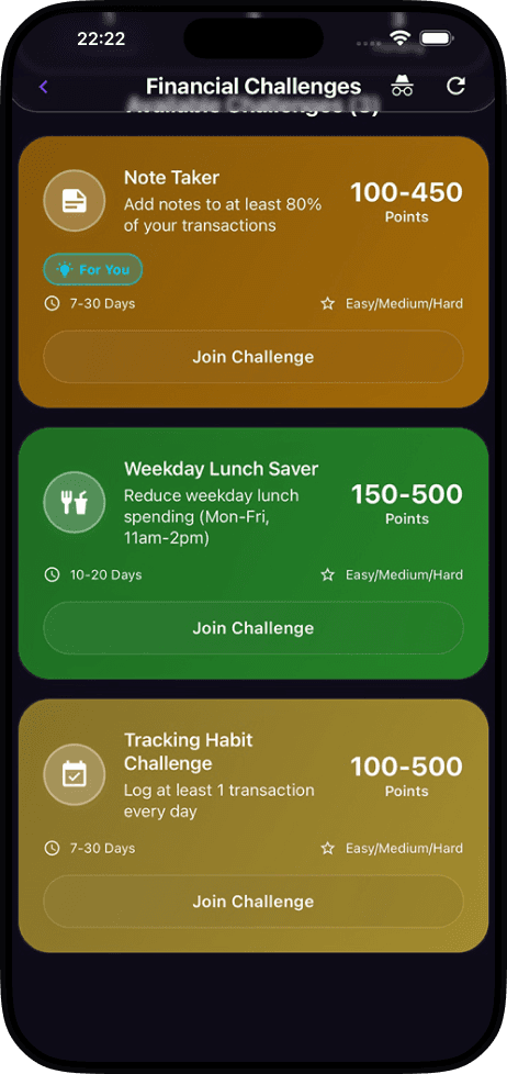 Turn daily spending into a game. Track your progress, stay disciplined, and unlock rewards as you complete each challenge.