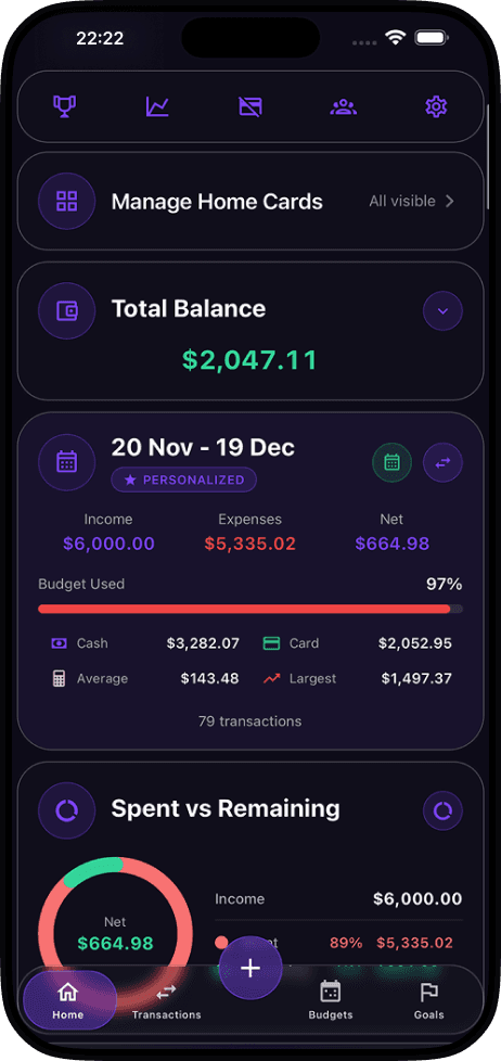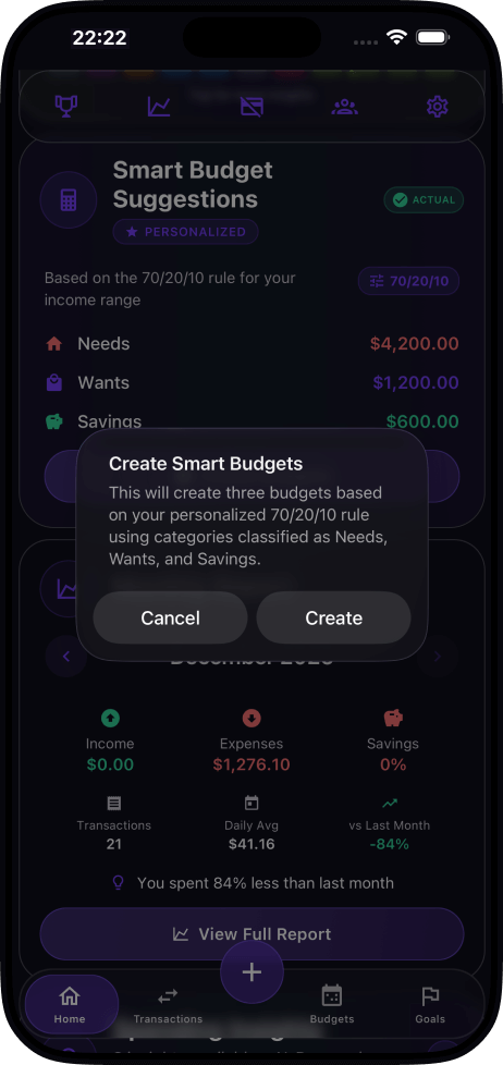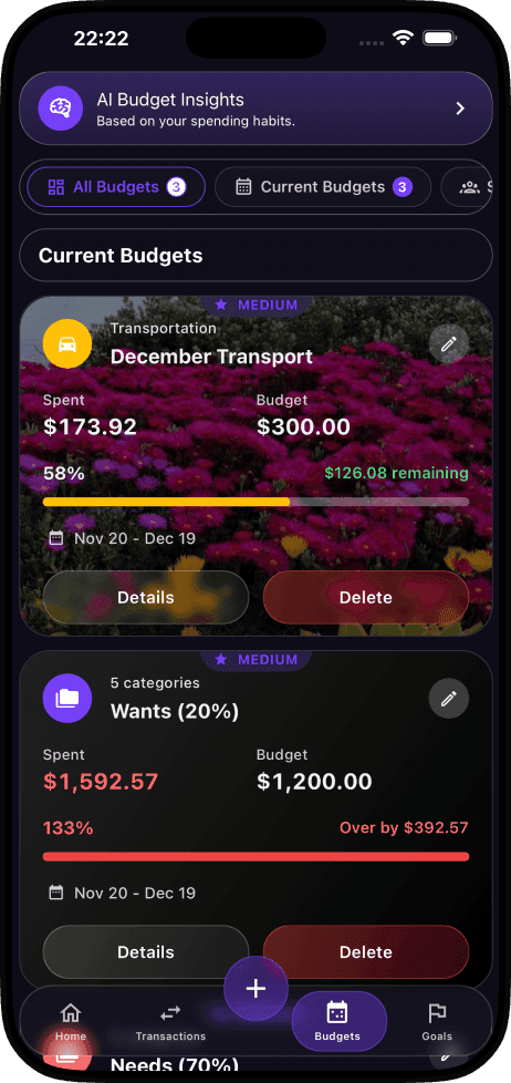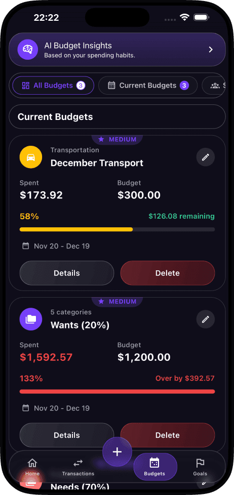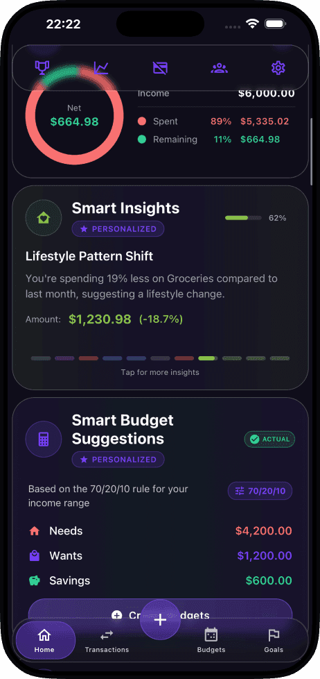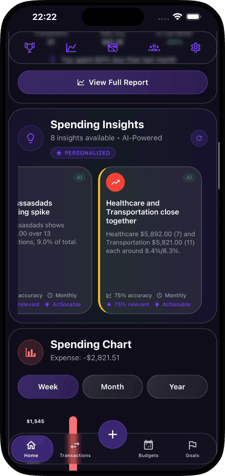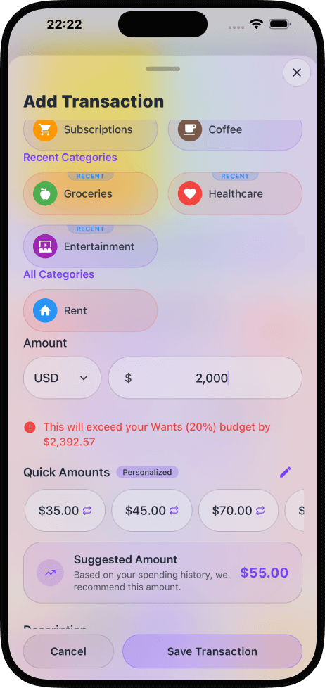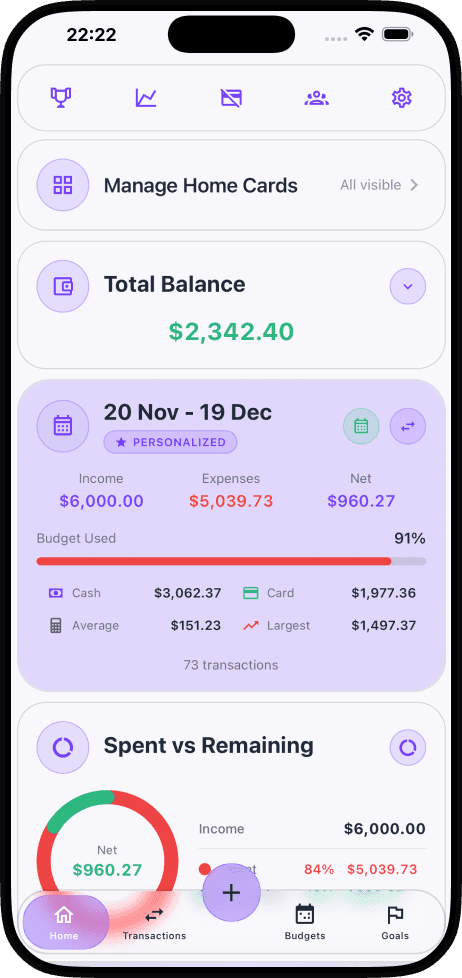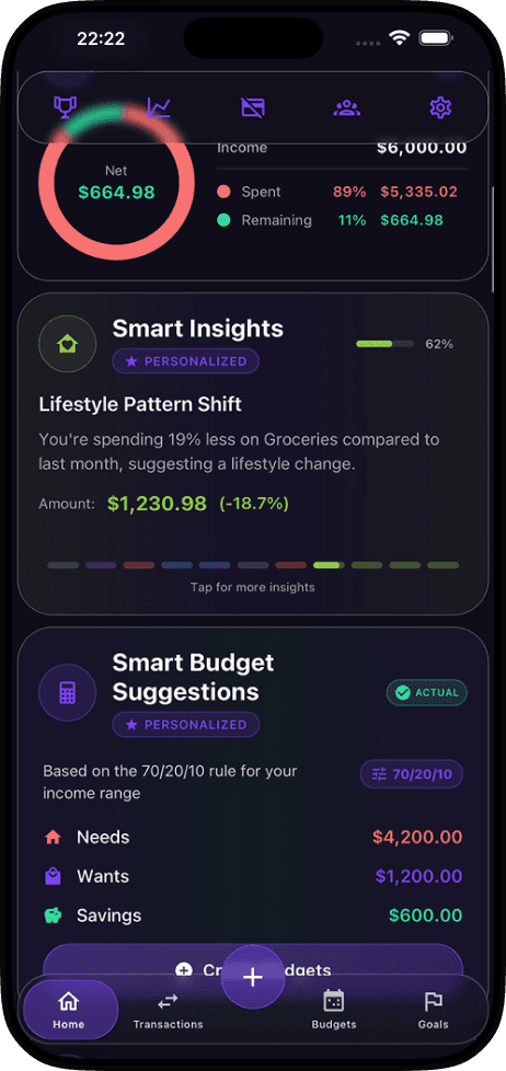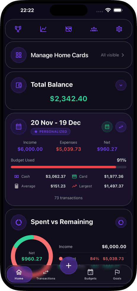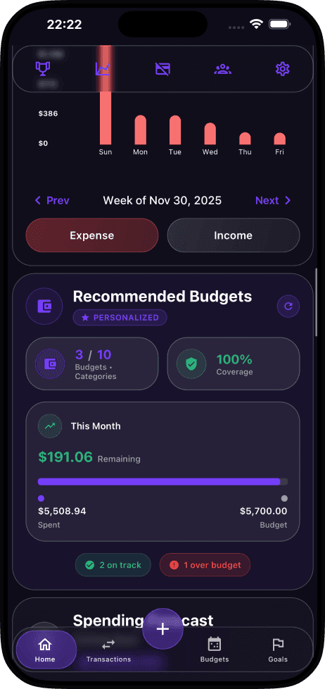 See your total balance, income, expenses, and remaining budget at a glance. Get smart insights and budget suggestions that help you stay in control every day.