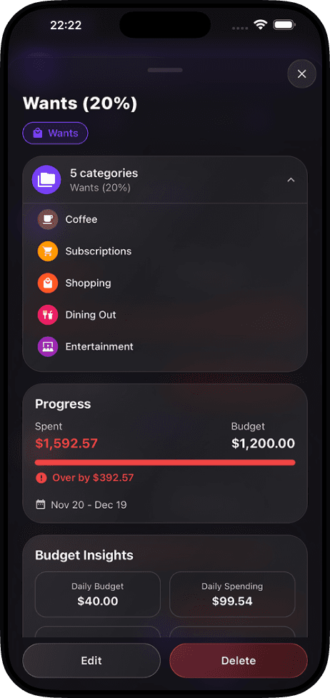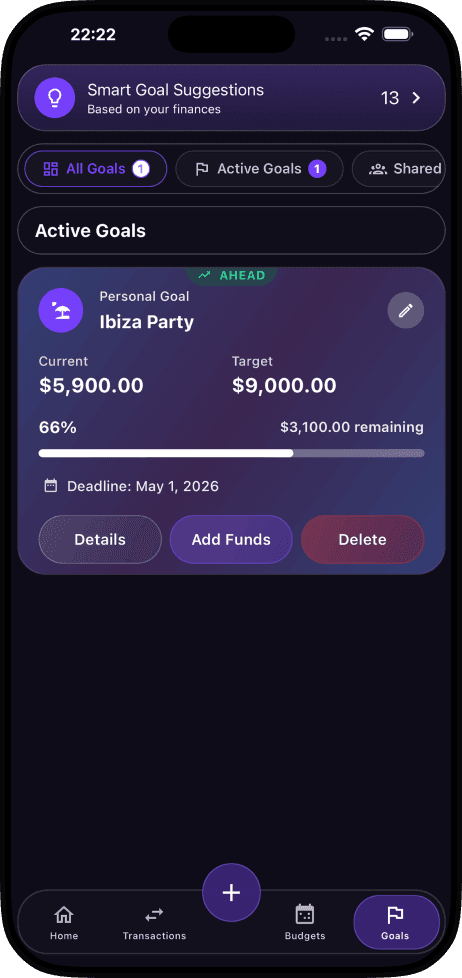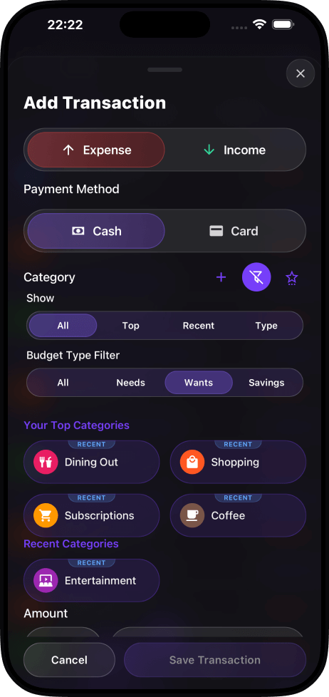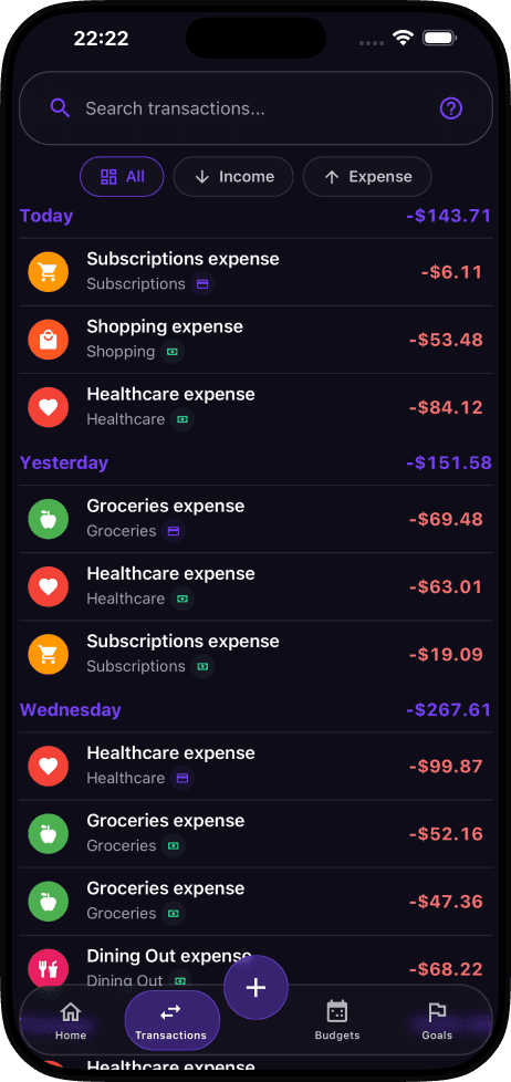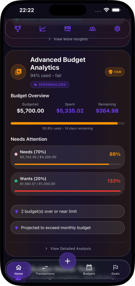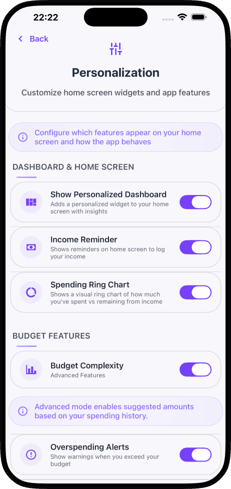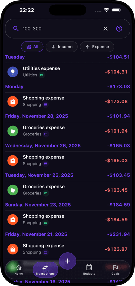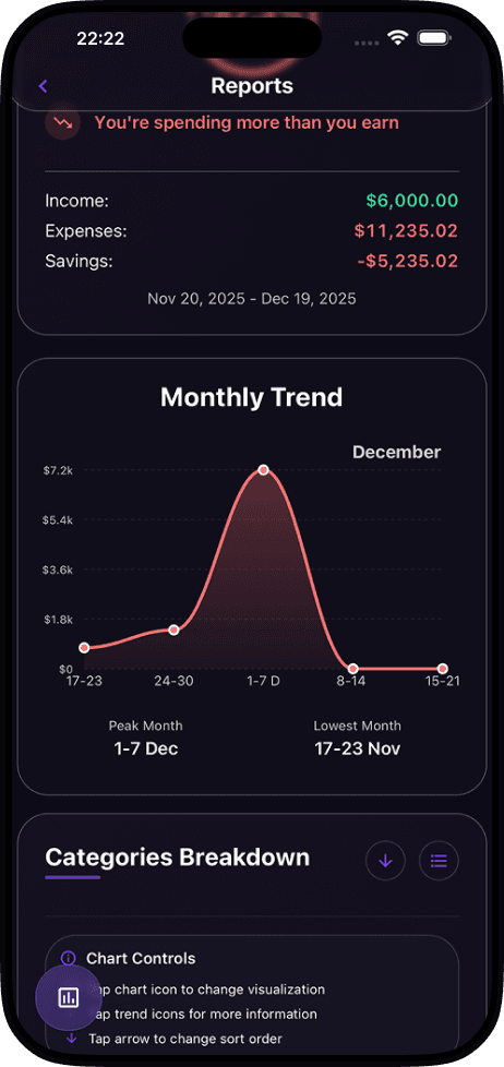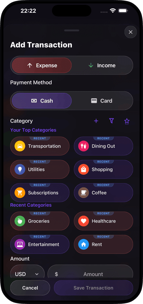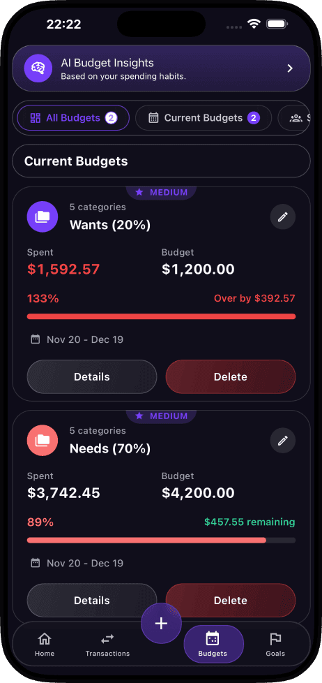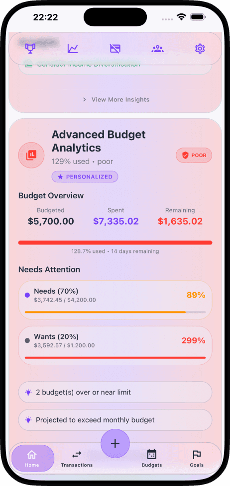 See your total balance, income, expenses, and remaining budget at a glance. Get smart insights and budget suggestions that help you stay in control every day.