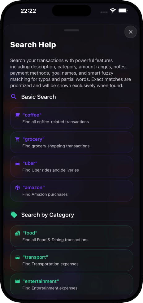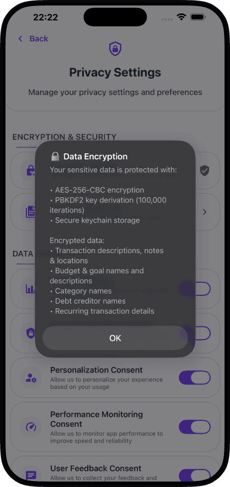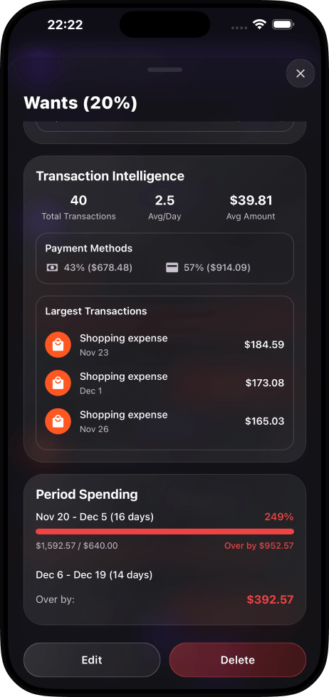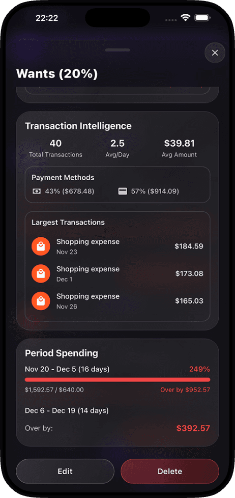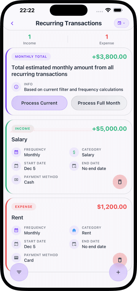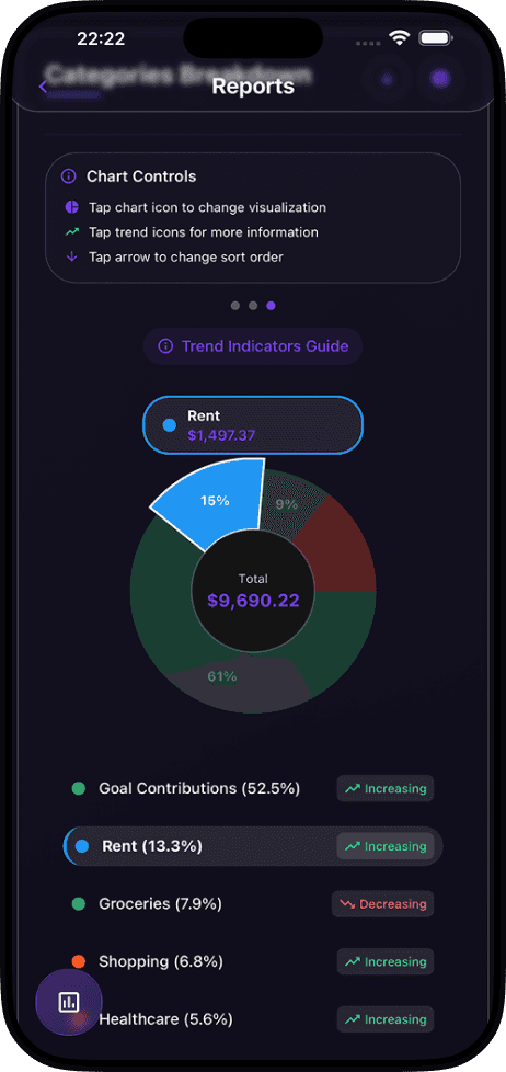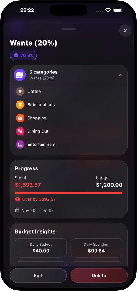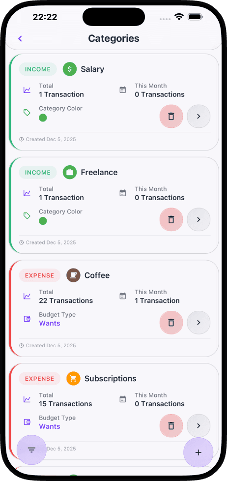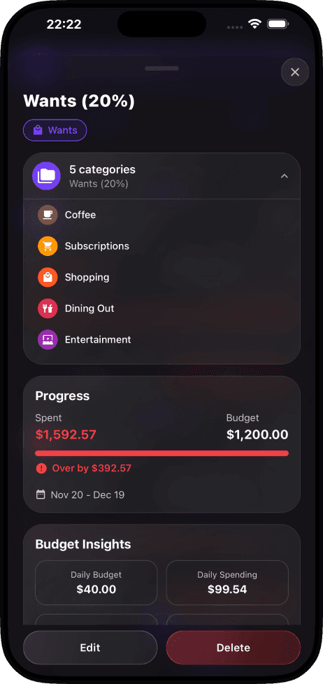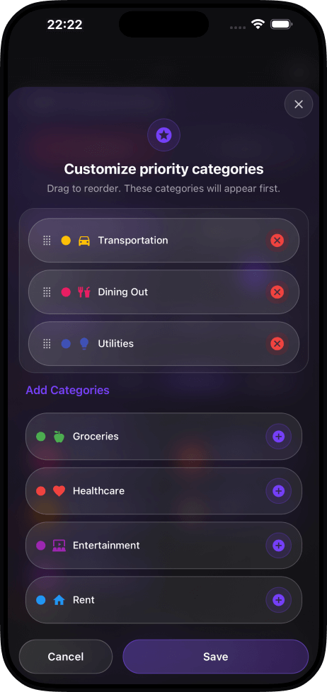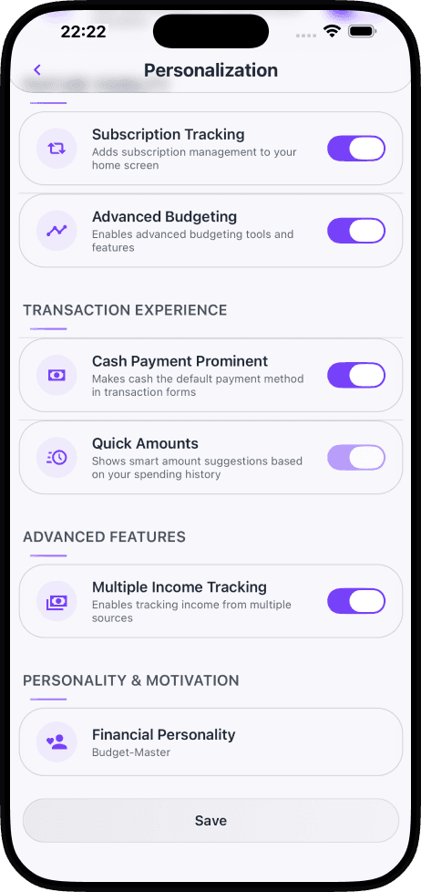 See your total balance, income, expenses, and remaining budget at a glance. Get smart insights and budget suggestions that help you stay in control every day.
