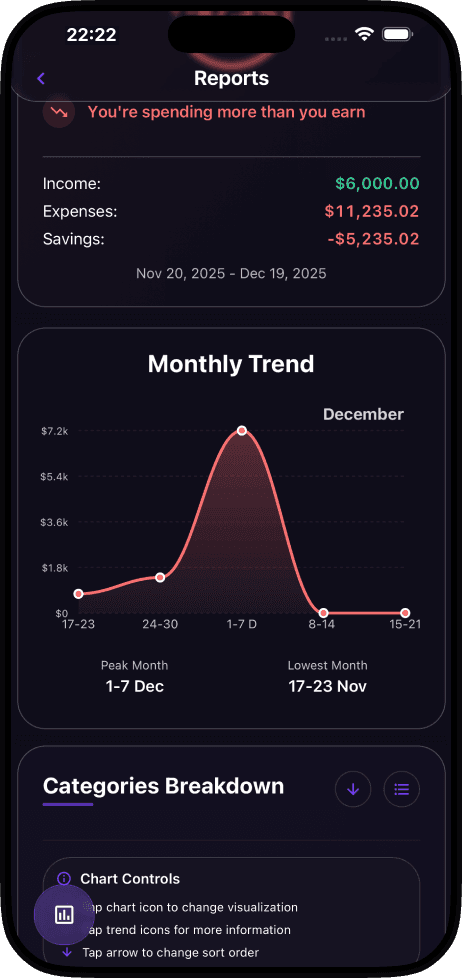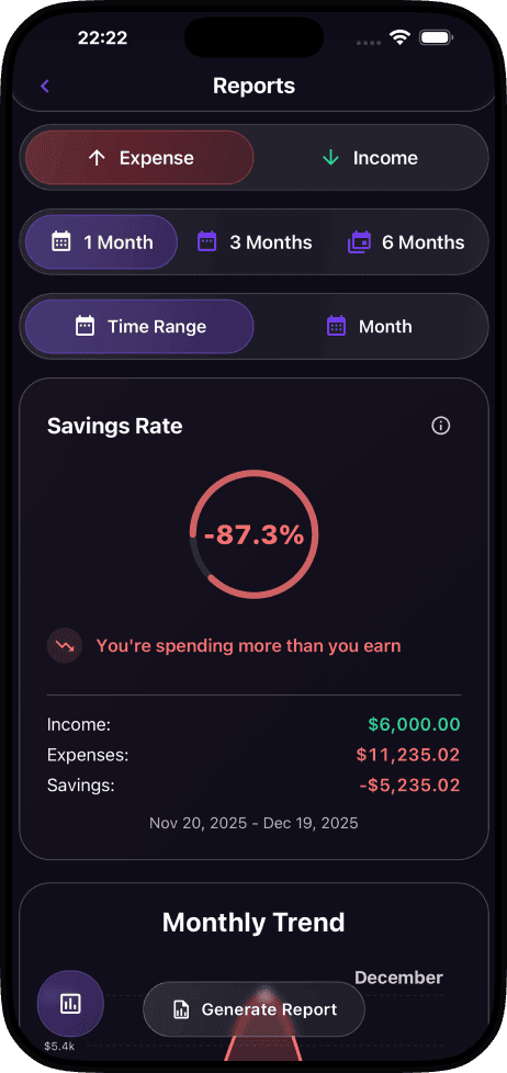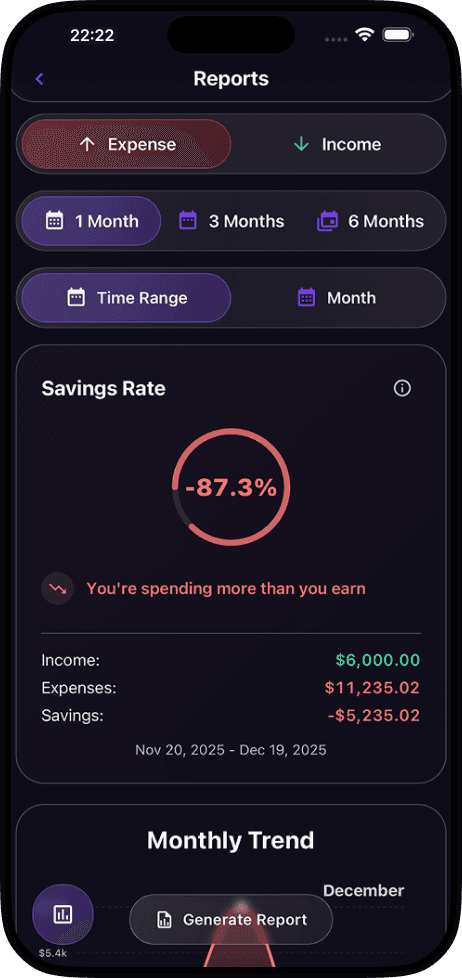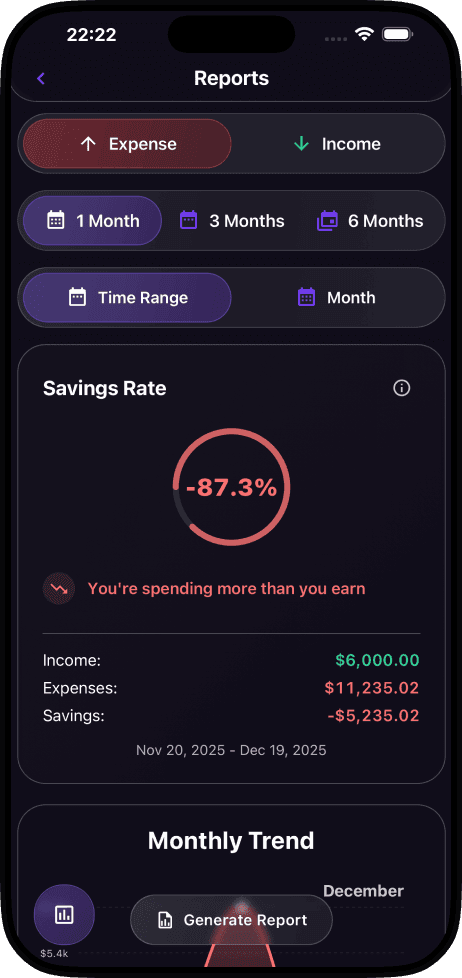 Visualize your financial trajectory with precision. Identify negative savings rates instantly, analyze monthly trends, and drill down into category breakdowns to restore positive cash flow.